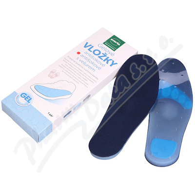 Vložky vyrobeny z měkkého silikonového gelu, podepírají podélnou a příčnou klenbu. Světlemodré měkčí plochy pod klouby prstů a patou změkčují došlap. Umožní snadné nazouvání do obuvi.