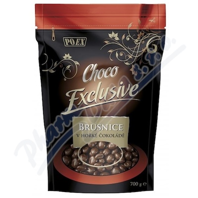 Brusnice v hořké čokoládě. Produkt je složen z proslazených brusnic, které jsou obaleny v hořké čokoládě.