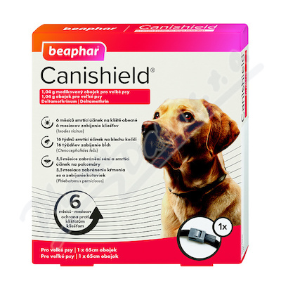 Medikovaný obojek pro velké psy. Délka 65cm. Indikace: Smrtící účinek na blechy kočičí po dobu 16 týdnů, smrtící účinek na klíště obecné po dobu 6 měsíců, zabránění sání a smrtící účinek na pakomáry po dobu 5,5 měsíce.
