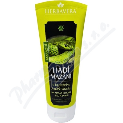 Hadí mazání s konopím obsahuje tripeptid syntetického jedu chřestýšovce pro uvolnění svalů. Dále obsahuje kaštan, kostival, kafr, mentol a směs bylin.