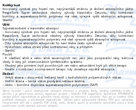 Inovovaný výrobek pro hojení ran, nejvýraznější změnou je složení absorpčního jádra. RespoSorb Super zachovává všechny výhody klasického Zetuvitu, díky kombinaci buničiny a superabsorpčního polymeru má však výrazně vyšší absorpční schopnost. Sterilní.
