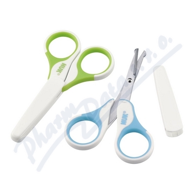 Dětské bezpečnostní nůžky na stříhání dětských nehtů. Zaoblený konec, protiskluzová držátka. S krytem. Nůžky se dodávají v různých barevných variacích.