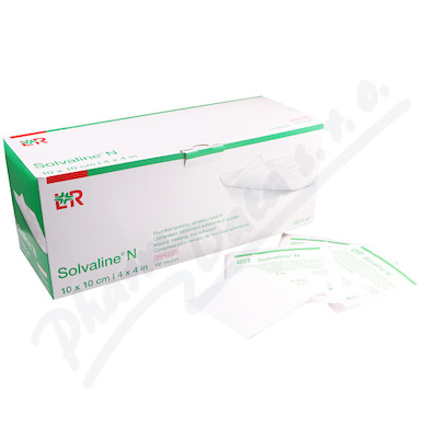 Komprese SOLVALINE, speciální savá, oboustranně použitelná, sterilní 10x10 cm. Z vysoce savé bavlněné vaty, která je na obou stranách pokryta jemně perforovanou polyesterovou fólií.