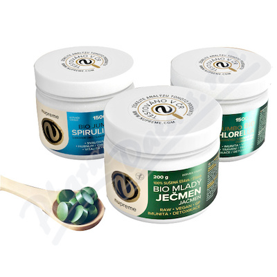 Balíček obsahuje Chlorellu 1500tbl BIO NUPREME, Spirulinu 1500tbl BIO NUPREME a Mladá ječmen 200g BIO NUPREME.