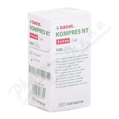 Kompresy z netkaného textilu ze směsi viskózy a polyesteru jsou složeny do čtyř vrstev pro vyšší savost a pevnost.