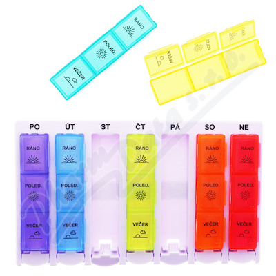 Týdenní dávkovač léků je rozdělen na 7 dní v týdnu pomocí zkratek názvů dnů v týdnu a každý den má 3 části - ráno, odpoledne, večer. Každá část se otevírá samostatně pomocí víčka, zatímco ostatní zůstávají pečlivě uzavřeny.