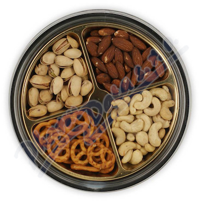 Obsahuje směs ořechů - kešu, mandle, pistácie a preclíky. Výrobek je zabalen v plastové doze, kterou je možné použít opakovaně.