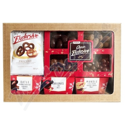 Dárková krabice - obsahuje tyto výrobky: preclíky v mléčné čokoládě, mandle v bílé a mléčné čokoládě s kokosem, datle v hořké čokoládě a skořicí, brusnice mix, směs chocho exclusive, kroužky v polevě s jogurtem