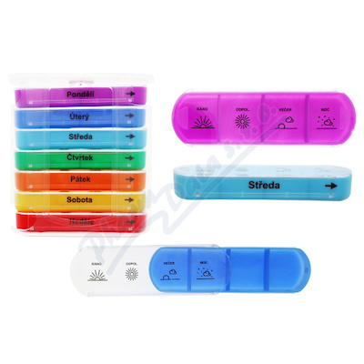 Týdenní dávkovač léků je rozdělen na 7 dní v týdnu pomocí zkratek názvů dnů v týdnu a každý den má 4 části - ráno/odpoledne/večer/noc. Každá část týdne se samostatně vysouvá z dávkovače, zatímco ostatní zůstávají pečlivě uzavřeny.