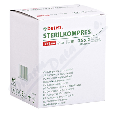 Kompresy z gázy sterilní jsou vyrobeny ze 100% bavlněných, bělených vláken, tkaných v počtu 17 vláken na cm2, jsou osmivrstvé. Dobrá savá schopnost, prodyšnost.
