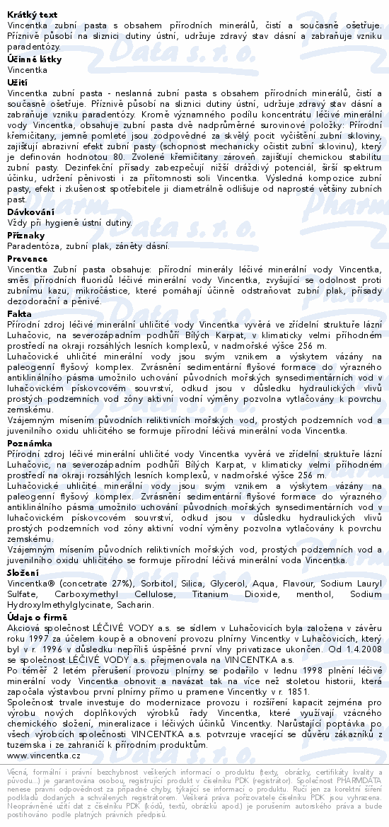 Vincentka zubní pasta s obsahem přírodních minerálů, čistí a současně ošetřuje. Příznivě působí na sliznici dutiny ústní, udržuje zdravý stav dásní a zabraňuje vzniku paradentózy.