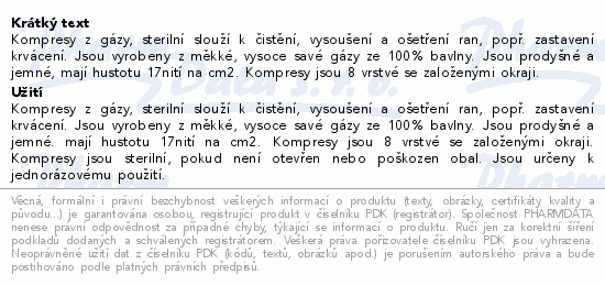 Kompresy z gázy, sterilní slouží k čistění, vysoušení a ošetření ran, popř. zastavení krvácení. Jsou vyrobeny z měkké, vysoce savé gázy ze 100% bavlny. Jsou prodyšné a jemné, mají hustotu 17nití na cm2. Kompresy jsou 8 vrstvé se založenými okraji.